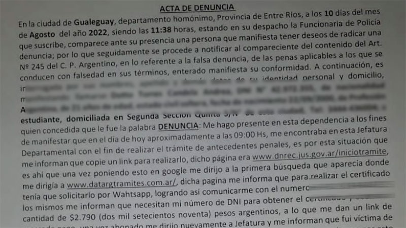 Asimismo, detalló que los estafadores a por whatsapp les envían un link donde las personas deben completar unos datos y luego de depositarles un dinero obtendrían el certificado que necesitan. “Todo es falso, la gente ingresa a la página, y le dicen que por 2.500 pesos le realizan el trámite, que en realidad cuesta 360 pesos, y que se quedan esperando el certificado que nunca le llega”.