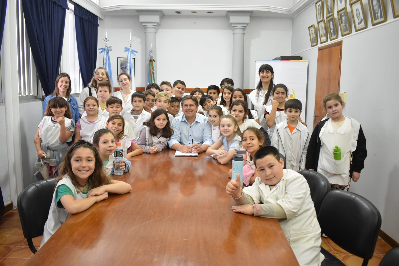 Continuando con las visitas guiadas que organiza el Área de Turismo municipal, en la jornada del miércoles, estudiantes y docentes de 3º grado de la Escuela Nº91 “La Pampa” visitaron al Presidente Municipal, Hernán Besel.
