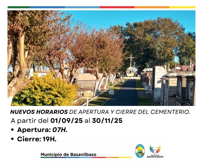 El Municipio de Basavilbaso informó que, a partir del 1º de septiembre y hasta el 30 de noviembre de 2025, el Cementerio local tendrá nuevos horarios de apertura y cierre.